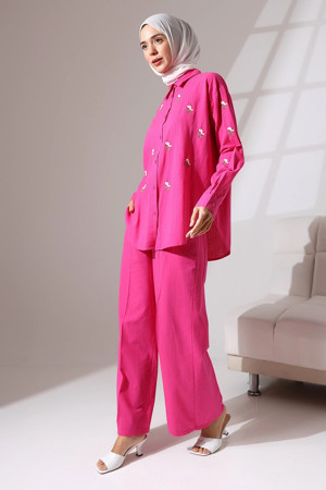 100% Pamuk Keten Günlük ve Rahat Çiçek Desen Nakışlı Pullu Gömlek Pantolon Yazlık Alt Üst Takım