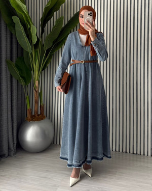Molly Nelly Kadın V Yaka Pile Detaylı Oversize Kot Tesettür Elbise