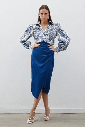 Düğme Aksesuarlı Saten Krep Etek - İndigo