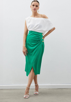 Düğme Aksesuarlı Saten Krep Etek - Yeşil