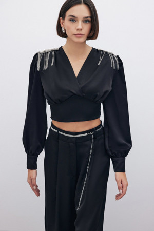 Omuz Aksesuarlı Kısa Bluz - Siyah