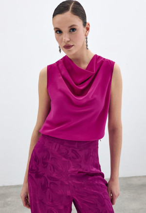 Degaje Yaka Kolsuz Bluz - Fuşya