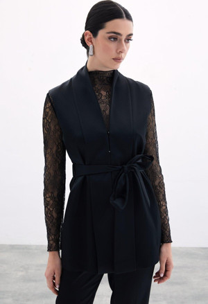 Kuşaklı Saten Yelek - Siyah