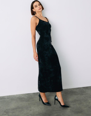 Sateen Askılı Kadife Midi Elbise - Siyah
