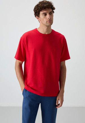 Kırmızı Waffle İnterlok Yüzeyi Dokulu Oversize Fit Basic Erkek T-Shirt - 88379