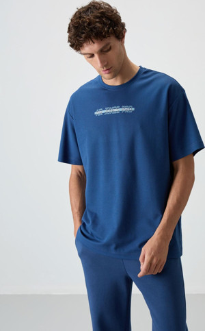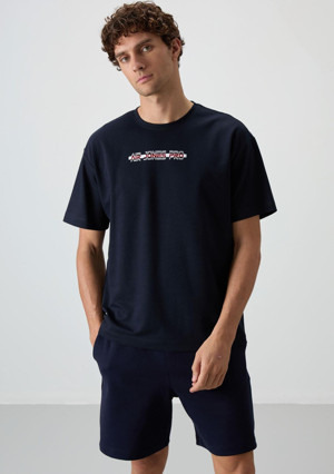 Lacivert Pamuklu Kalın Yüzeyi Dokulu Oversize Fit Baskılı Erkek T-Shirt - 88365