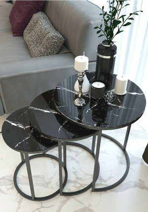 Usta Siyah Metal Kapiçino Mermer Desen Ahşap Tablalı 3 lü Zigon Sehpa