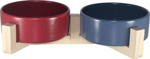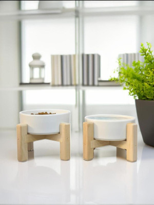 Seramik mama su kabı evcil hayvanlar için çift taraflı kullanılabilen ahşap ayağı ile beraber.