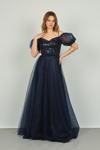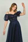 Detay: Uzun, balon kol, üst payetli, alt tül detaylı, astarlı abiye elbise;