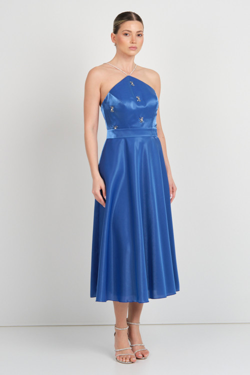 Detay: Boyundan bağlamalı, taş detaylı midi abiye elbise, parlak saten kumaşı, astarlı yapısı ve fermuarlı tasarımıyla özel davetlerde şıklığı garantilerken, serpme taş işlemeleri ve zincir taşlı boyun detayıyla göz alıcı bir ışıltı sunar. Modern zarafeti yansıtan bu elbise, nişan, mezuniyet ve düğün gibi özel günler için ideal bir tercihtir;