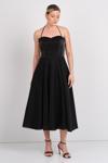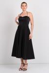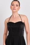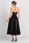 Detay: Bu model abiye elbise; saten kumaştan tasarlanmış olup boyundan bağlamalı ve sırttan çapraz bağlamalı yapısıyla zarif bir duruş sergiler; midi boy kesimiyle ölçülü şıklık sunar, göğüs kısmı taş işlemeli detaylarla süslenmiştir; korsajlı yapısıyla vücuda oturur, astarlı ve fermuar kapamalıdır;