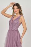 Detay: Ön-arka V yaka, göğüs kısmı tül, uzun, astarlı abiye elbise;