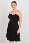 Detay: Şifon kumaştan üretilmiş, sırt çapraz ip bağlamalı, kısa, yaka ve eteği fırfır detaylı, astarlı ve fermuar kapamalı abiye elbise, zarafeti ve romantik dokunuşları bir araya getiren etkileyici bir tasarımdır. Hafif ve akışkan yapısıyla şifon kumaş, elbiseye büyüleyici bir hava katarken, fırfır detayları hareketli ve dinamik bir görünüm sunar. Sırt kısmındaki çapraz ip bağlama detayı sofistike bir dokunuş eklerken, fermuar kapama özelliği pratik bir kullanım sağlar. Astarlı yapısı sayesinde konforlu bir deneyim sunan bu kısa abiye elbise, özel davetlerde, düğünlerde ve kokteyl organizasyonlarında fark yaratmak isteyenler için mükemmel bir seçimdir. Zamansız şıklığı ve modern detayları bir araya getiren bu tasarım, stil sahibi kadınların gardırobunda mutlaka bulunması gereken parçalar arasında yer alıyor.;
