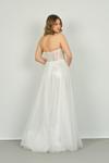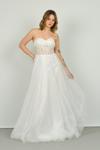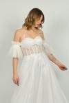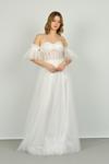 Detay: Seyyar kol, üst kısım taş işlemeli, alt kısım kloş ve tül, astarlı abiye elbise;