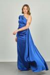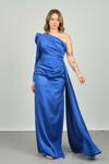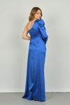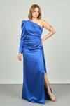 Detay: Tek omuz ve tek kol detaylı, yırtmaçlı, kuyruklu, uzun abiye elbise ;