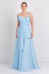 Detay: Bu model abiye elbise; kloş kesimiyle hareketli bir siluet sunarken, şifon kumaşıyla hafif ve zarif bir görünüm sağlar; maxi boy uzunluğuyla etkileyici bir duruş sergiler, askı ve bel kısmı taş işlemeli detaylarla süslenmiştir; arkası çapraz bağlamalı tasarımıyla modern bir dokunuş taşır, astarlı ve fermuar kapamalıdır;