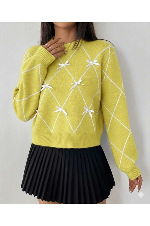 - Modern ve şık bir görünüm için baklava deseniyle süslenmiş, gençlerin enerjisini yansıtan triko kazak.