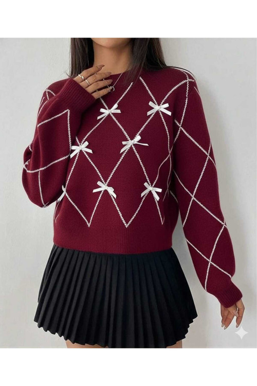 Baklava Desenli Kurdele/Fiyonk Detaylı Triko Kazak