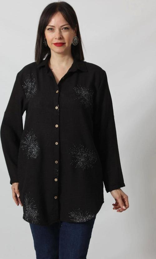 Moda Berray SB-092 SİYAH GÜMÜŞ YALDIZLI GÜNEŞ DESENLİ KOLU APOLETLİ YANDAN CEPLİ TUNİK GÖMLEK KADIN BÜYÜK BEDEN