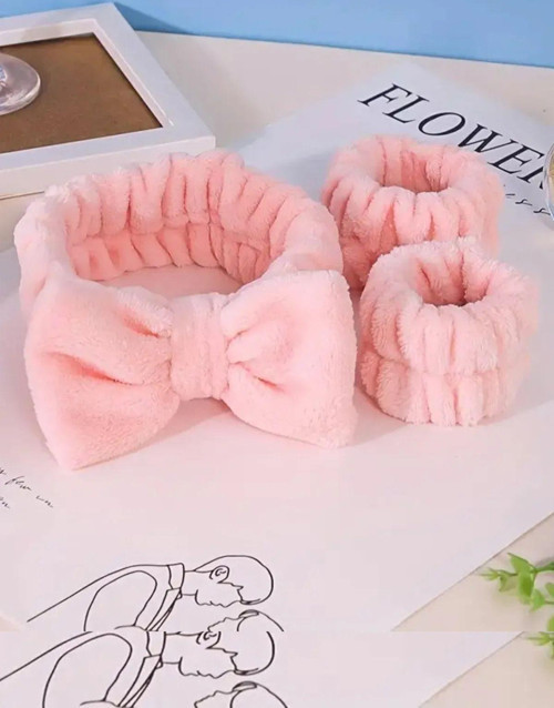 SB SizinBazar Şeker Pembe Rengi Süper Soft Spa Takımı - 2 Adet Havlu Yıkama Bilekliği Ve Elastik Saç Bandı Takımı