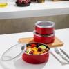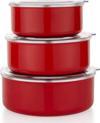 Schafer Komfort Saklama Kabı Seti, şık kırmızı emaye yüzeyi ve vakumlu kapaklarıyla mutfakta düzeni ve tazeliği bir araya getirir. Farklı boyutlarıyla ister dolapta, ister masada pratik kullanım sağlar. Emayenin dayanıklılığı sayesinde uzun ömürlü ve güvenli bir saklama çözümüdür.