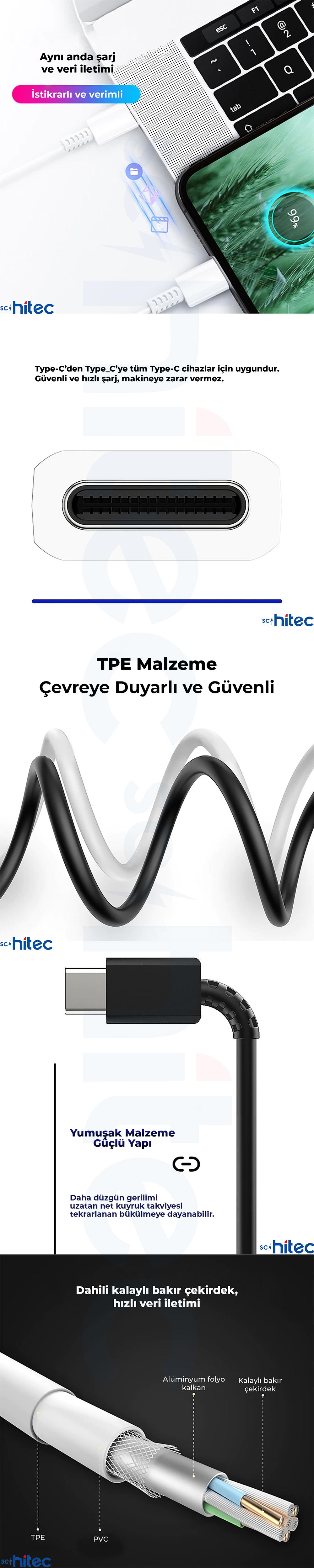Yüksek kaliteli TPU mazlemeden üretilen ve son derece sağlam bir kablodur. Type-C girişli tüm telefon, tablet, Laptop, Notebook, Macbook, Matebook, Matepad, tüm multimedya cihazlarınızı güvenle kullanarak şarj edebilirsiniz. Kablo kopmasına karşı tpu tasarım sistemiyle kuvvetlendirilmiştir. Kablo içi bakır malzemeden üretilmiştir. Cihazınızda bulunan akıllı şarj entegresi ile eşleşerek çalışmaktadır. Çantanızda cebinizde kolayca taşıyabilirsiniz. Taşınabilir harici powerbanklarda güvenle kullanabilirsiniz. İhtiyacınıza göre bilgisayar ve ilgili cihaz arasında sorunsuz bir biçimde hızlı veri aktarımı sağlayabilirsiniz. Type-C port çıkışlı tablet , telefon ve diğer tüm cihazlarda güvenle kullanabilirsiniz.