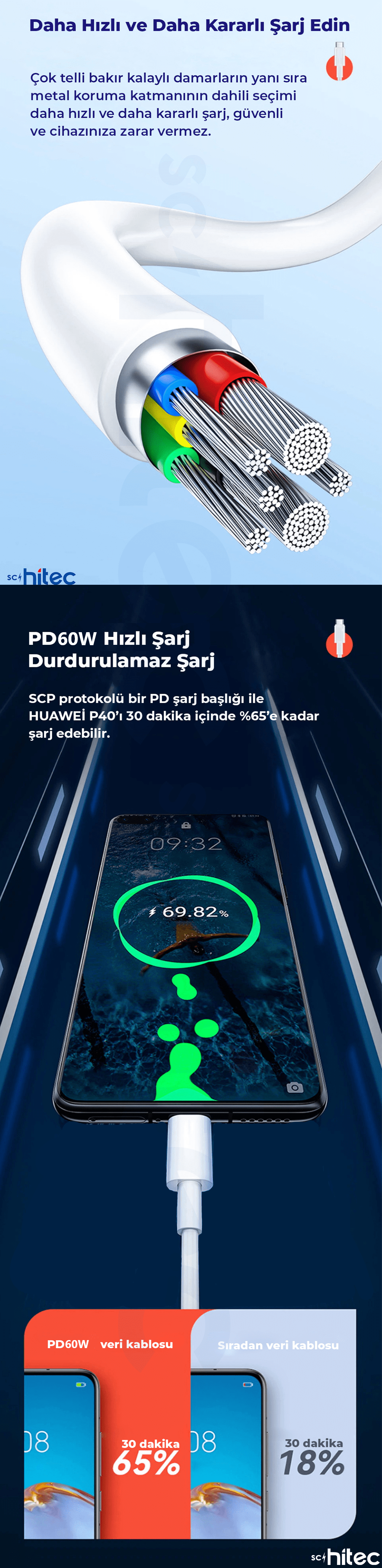 Kablo dayanıklılığına ek olarak alüminyum başlıklı kablo uçları ve korozyondan etkilenmeyen soketleri 10000' den fazla takma çıkarma döngüsüne kadar ilk günkü gibi çalışır. ScHitec 6A 60W Data ve Şarj kablosunu tüm akıllı telefonlardan harici olarak Type-C girişi bulunan tüm akıllı telefonlarınızda kullanarak hızlı şarj performansından faydalanabilirsiniz.