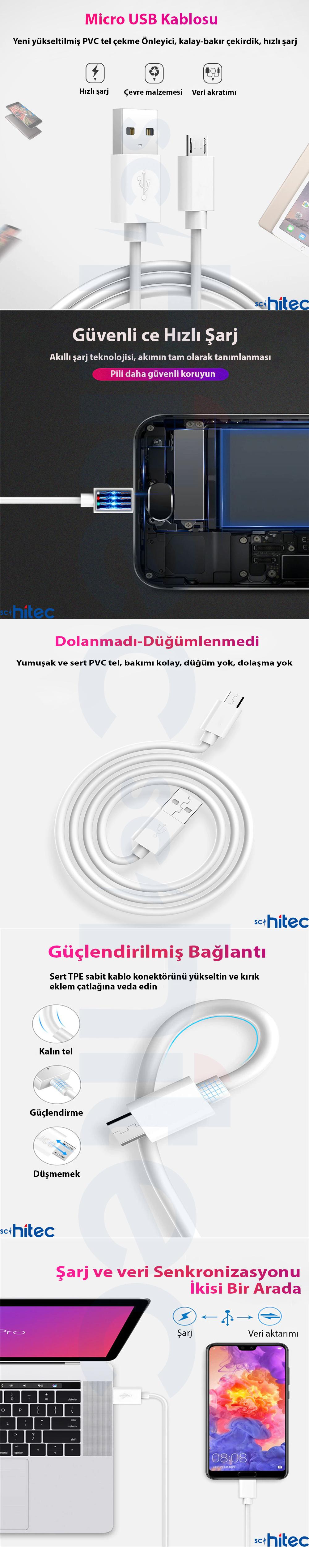 ScHitec Honor 8S UsbA to Micro 2Metre Data ve Hızlı Şarj Kablosu