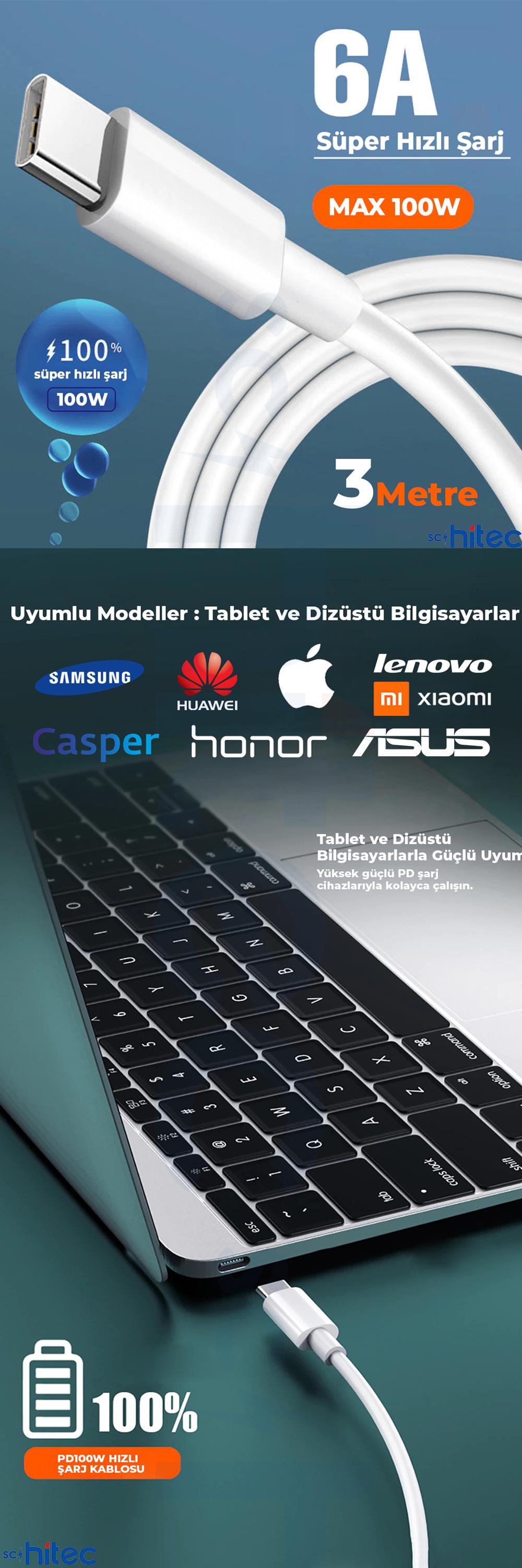 Yüksek kaliteli TPU mazlemeden üretilen ve son derece sağlam bir kablodur. Type-C girişli tüm telefon, tablet, laptop, Notebook, Macbook, Matebook, Matepad, tüm cihazlarınızı güvenle kullanarak şarj edebilirsiniz. Kablo kopmasına karşı tpu tasarım sistemiyle kuvvetlendirilmiştir. Kablo içi bakır malzemeden üretilmiştir. 3 metre uzunluğa sahiptir. 6A maximum 100W gücü destekler. Cihazınızda bulunan akıllı şarj entegresi ile eşleşerek çalışmaktadır. Çantanızda cebinizde kolayca taşıyabilirsiniz. Taşınabilir harici powerbanklarda güvenle kullanabilirsiniz. İhtiyacınıza göre bilgisayar ve ilgili cihaz arasında sorunsuz bir biçimde hızlı veri aktarımı sağlayabilirsiniz. Type-C port çıkışlı tablet , telefon ve diğer tüm cihazlarda güvenle kullanabilirsiniz. Ürün hılzı Şarj, Huawei Süper Şarj, Oppo, Realme, Oneplus Dash Şarj, Vooc hzlı şarj, Samsung Fast Şarj, Mi Turbo Şarj protokollerini desteklemektedir. Toplamda 100W'lık gücü iletme kapasitesinin yanında Quick Charge 3.0 teknolojisini de destekler.