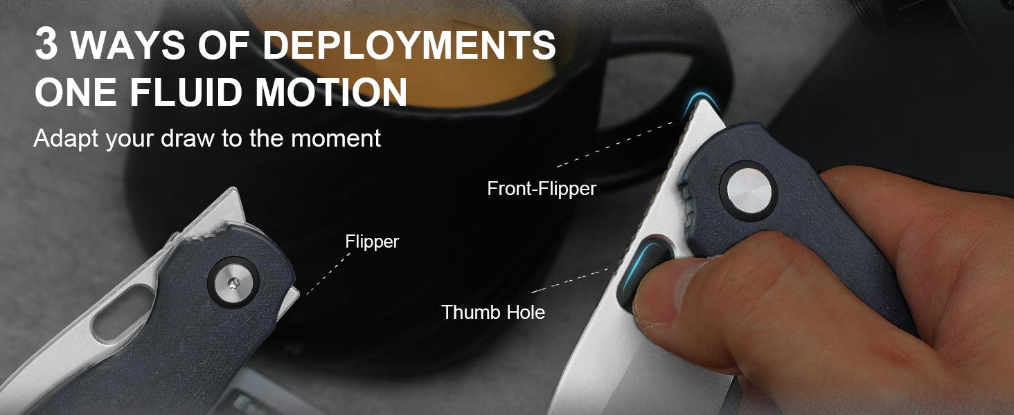 Ön kapakçığı işaret parmağınızla taktiksel bir tutuşla hızlıca açın, kapakçığı doğal baş parmak açılımı için kullanın veya başparmak deliğinden döndürerek açın; hepsi tek elle ve sezgisel. İster yüksek baskı gerektiren durumlarda ister günlük işlerde kendi hızınızı ayarlayın.