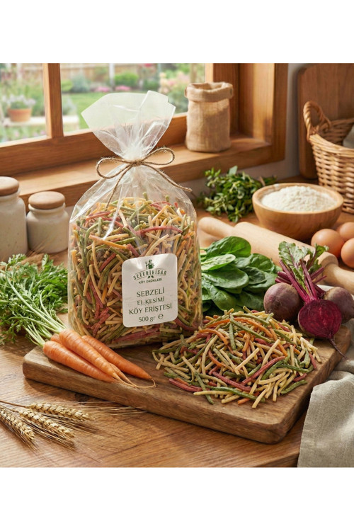 Hiçbir yapay renklendirici içermeyen bu sebzeli köy eriştesi, geleneksel yöntemlerle elde kesilerek sofralarınıza doğallık taşır. Sofralarınızda bir gökkuşağı görmeye hazır mısınız? Seferihisar’ın taptaze sebzeleriyle hazırladığımız sebzeli köy eriştesi, doğanın en canlı renklerini ve en saf besin değerlerini tek bir pakette buluşturuyor.
