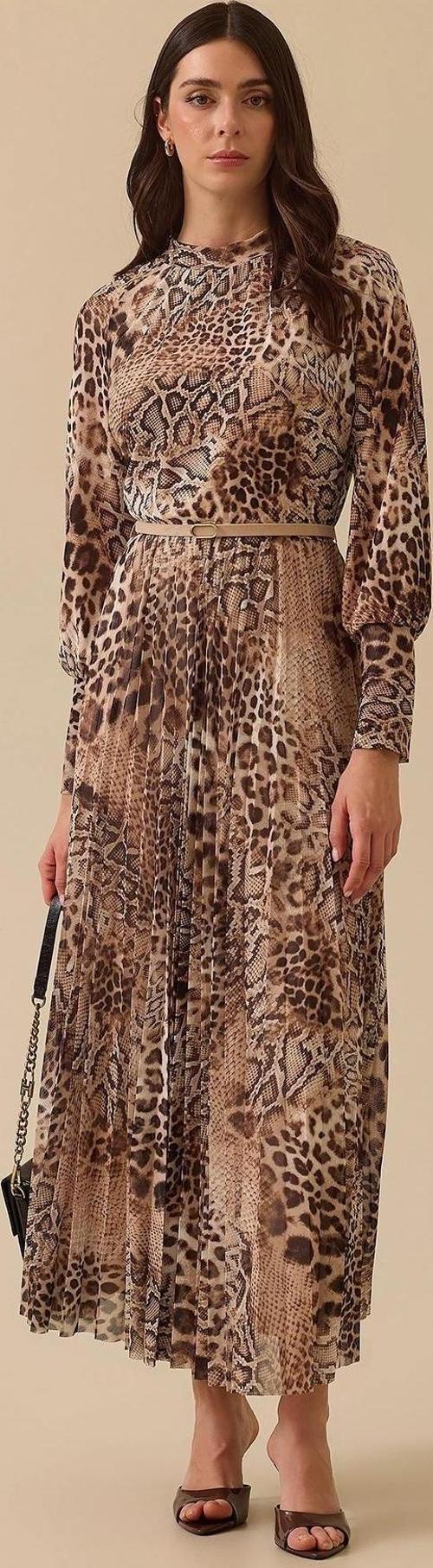 Detay: Şıklık ve cesareti bir araya getiren bu dokuma elbise, maksi boyu ve dik yaka tasarımı ile dikkat çekiyor. Leopar desenli tül kumaşı ve balon kolları sayesinde göz alıcı bir duruş sergileyen elbise, lastik beli ve kemer aksesuarı ile rahatlığı da elden bırakmıyor. Uzun kolları ve zarif yapısı ile modern bir görünüm sunan bu elbise, Design koleksiyonunun en dikkat çekici parçalarından biri. Hem günlük hayatta hem de özel davetlerde tercih edilebilecek bu elbise ile stilinizi ön plana çıkarın;
