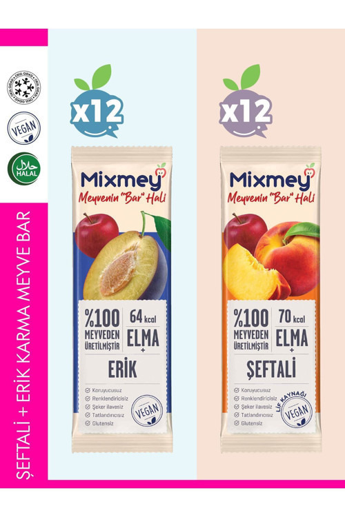 Mixmey Şeftali + Erik Karma Meyve Bar | Vegan, Doğal ve Glutensiz Sağlıklı Atıştırmalık 20g x 24 Adet