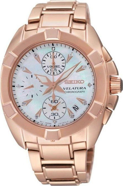 Mağazamızdan alacağınız ürünler Seiko"nun resmi distribütörü olan, AYDIN SAAT"in ürünleridir; Uluslararası geçerli garanti belgesi, sertifikası, kutusu ve faturası ile beraber müşteriye gönderilmektedir ÖZELLİKLER Quartz Kronograf (1/20 Saniye)Kalibre 7T92100 m su geçirmezlikYuvarlak, pembe altın kaplama paslanmaz çelik kasa36,5 mm kasa çapıSedef kadran11 adet pırlantaSafir camVidalı arka kapakPembe altın kaplama paslanmaz çelik bilezik1/20 saniye aralıklarla 12 saate kadar ölçüm yapabilen kronografAra zaman ölçümü;