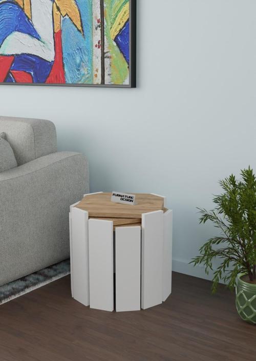 Cmkstore Sekizgen Üçlü Zigon Sehpa Seti Sunta Yan Sehpa Atlantik Çam - Beyaz