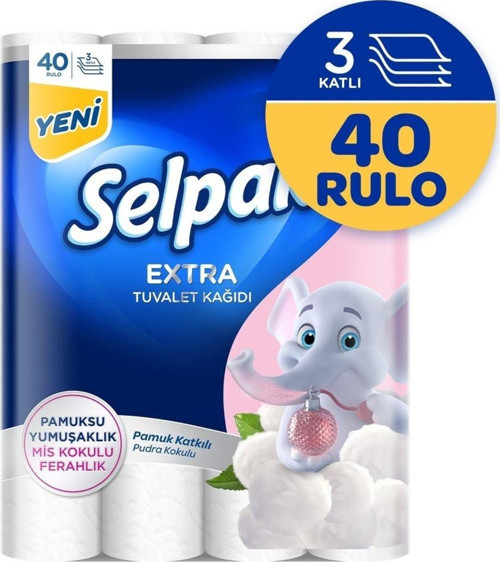 Selpak® Extra Pamuk Katkılı ve Pudra Kokulu Tuvalet Kağıdı 40'lı Pamuksu yumuşaklık ve mis gibi bir ferahlık arayanlar için yepyeni bir ürün. Bebeksi kokusu ve en yumuşak haliyle cildinize dost!