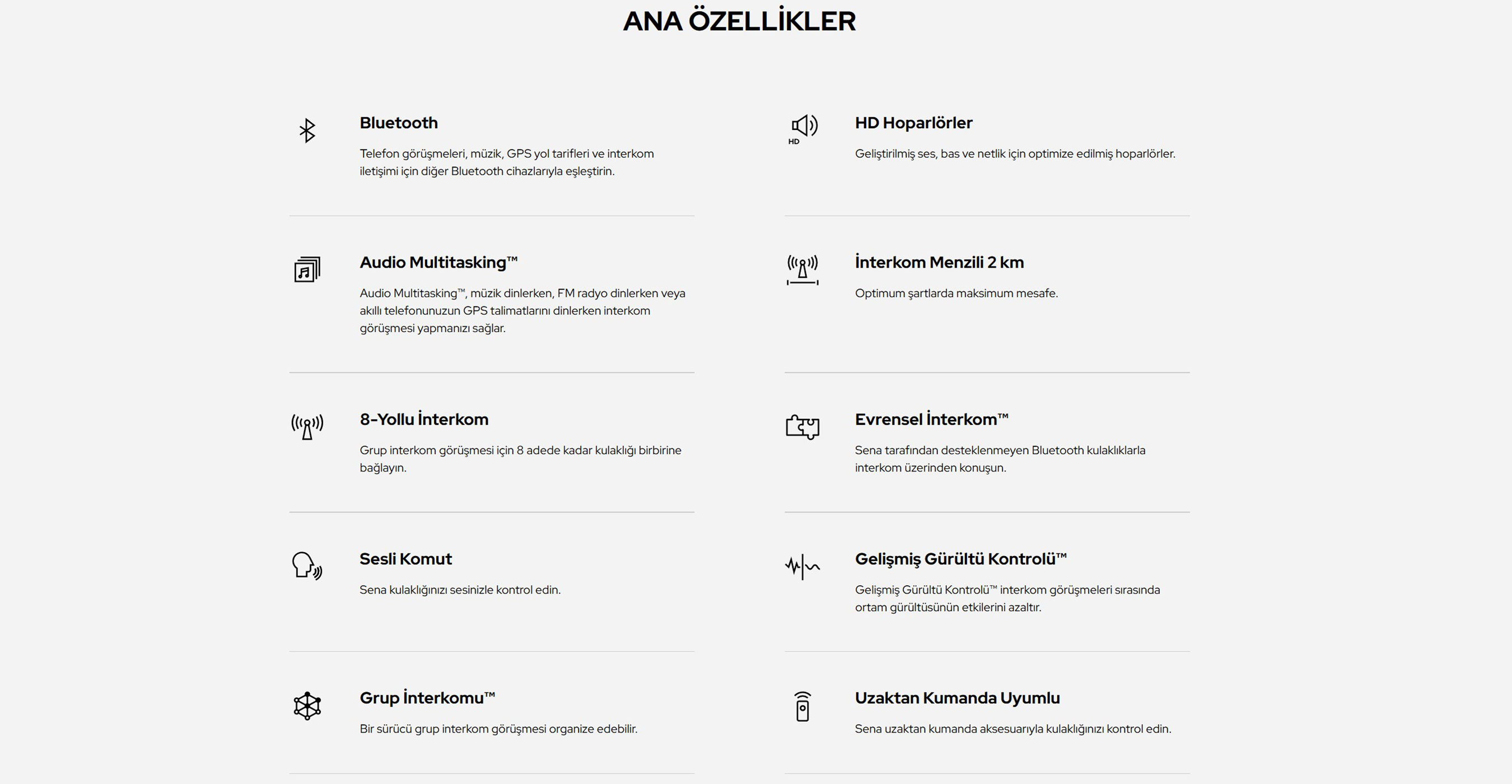 - Üniversal İnterkom: Sena marka olmayan Bluetooth interkomlarla bağlantı. (1 bağlantıya kadar)