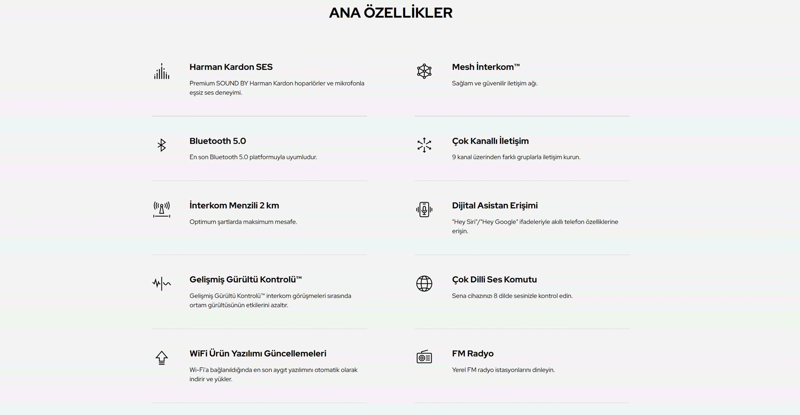 - Grup İnterkom: Bluetooth 4 Kişiye Kadar, Group Mesh 24 Kişiye Kadar, Open Mesh 9 Kanal (Sınırsız Katılımcı Sayısı)