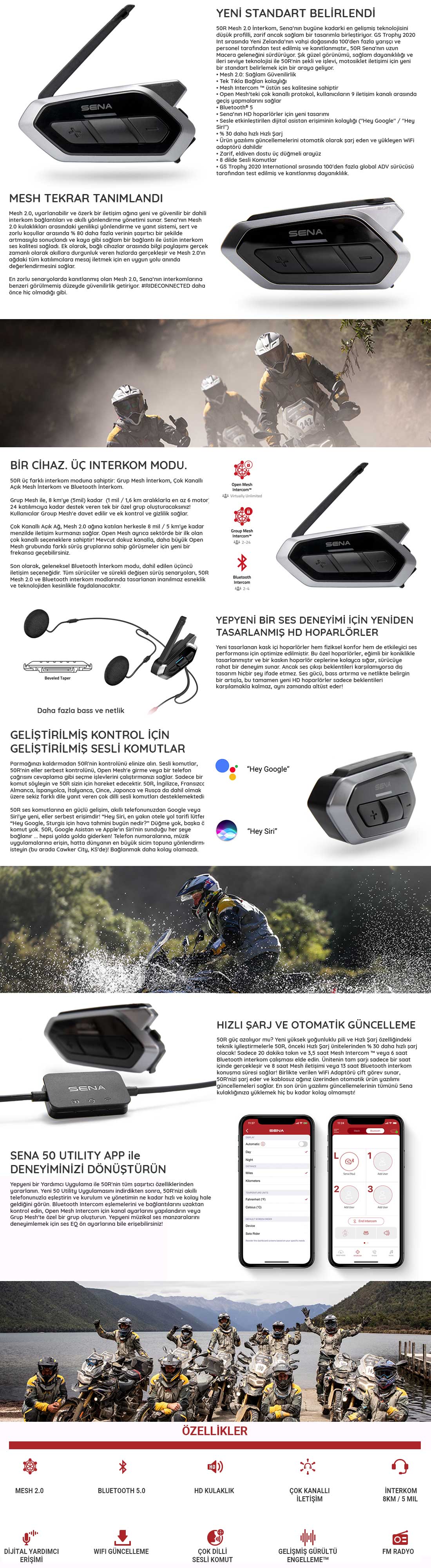 50R: Motosiklet İletişiminde Yeni Çağ. Sena’nın ileri Mesh teknolojisi, Harman Kardon’un üstün sesiyle birleşti. Zorlu GS Trophy’de 100+ test sürücüsüyle onaylanan 50R, sağlamlık, güçlü ses ve üstün teknolojiyi bir arada sunuyor. Mesh Intercom™ ile kalabalık gruplarla bile kesintisiz iletişim kurabilir, Harman Kardon ses kalitesiyle yolculuklarınızda müziğin keyfini çıkarabilirsiniz. Tek tıkla kolay tak/çıkar sistemi, yola çıkıştaki hazırlığınızı hızlandırırken, Sesli Komutlar dikkat dağılmadan tüm kontrolleri elinizde tutmanızı sağlar. WiFi adaptörü sayesinde cihazınız her zaman güncel ve hazır. 50R ile motosiklet iletişiminde yeni bir çağa adım atın.