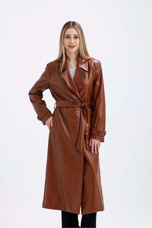 Sense Astarlı Beli Kuşaklı Apoletli Suni Deri Trençkot Pardüsü Taba
