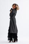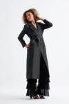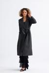 Sense markasının şıklığı ve zarafeti bir araya getiren astarlı uzun desenli trençkotu, antrasit rengiyle dikkat çekiyor.