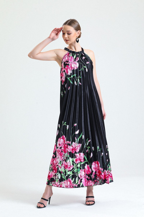 Sense Boyundan Bağlamali Piliseli Dijital Baskili Kolsuz Saten Elbise Siyah Çiçekli Elb34513 Elb34513