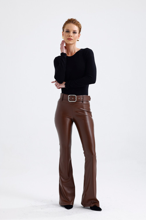 Sense Kemerli İspanyol Paça Suni Deri Pantolon Çikolata Pnt33313 Pnt33313