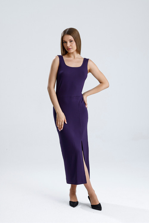 Sense Kolsuz Kare Yaka Yırmaçlı Örme Viskon Elbise | Elb36253 Mor