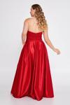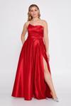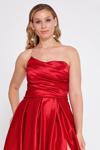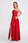 Detay: Asimetrik straplez yaka, derin yırtmaçlı, astarlı, uzun abiye elbise;