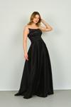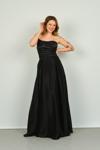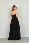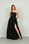 Detay: Asimetrik straplez yaka, derin yırtmaçlı, astarlı, uzun abiye elbise;
