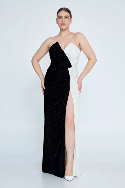 Detay: Simli dokusuyla göz alıcı bir ışıltı sunan bu straplez abiye elbise, çift renk kumaş tasarımıyla modern ve dinamik bir stil yaratır. Likralı yapısı sayesinde vücuda mükemmel uyum sağlarken, derin yırtmaç detayıyla cesur ve feminen bir siluet kazandırır. Astarlı iç yapısı konforu garanti ederken, özel davetlerde iddialı bir görünüm arayanlar için etkileyici bir tercihtir;