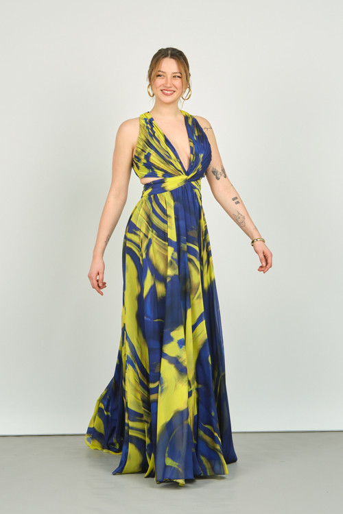 Detay: Şifon, boyundan bağlamalı, derin yırtmaçlı, sırt detaylı, uzun, astarlı abiye elbise;