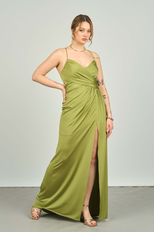 Detay: İp askılı, sırt detaylı, uzun, astarlı abiye elbise;