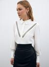 Gömlek yaka, geniş manşetli balon kol, şerit aksesuarlı bluz.